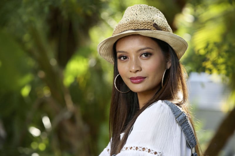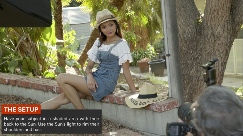 It’s just that little bit of rim light coming through is giving us a few highlights on her hair, on her back, and on her hat. If I’m out in direct sun, I’ll throw up a translucent to make it look like she’s in the shade or just a plain reflector to get her out of the sun.