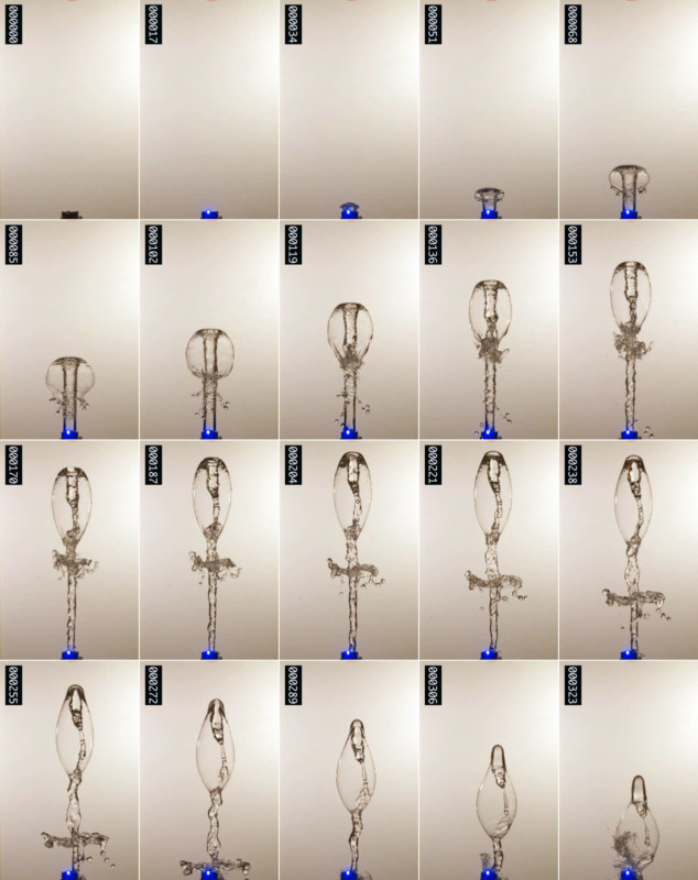Above is a typical sequence of shapes from the water bell system. Imaged with a Chronos camera running at 1057 frames per second (www.krontech.ca). The blue LED light at the bottom of each frame is an indicator that turns on when the air valve is opened. The start of the blue light is a reference for timing with the microprocessor. Between each of the images above is 16 ms. This full sequence covers .305 seconds. The largest the water bell forms in this sequence is about 12 cm in diameter. In this sequence, the air valve was open for 75 ms. and the compressor was set to 35 PSI.