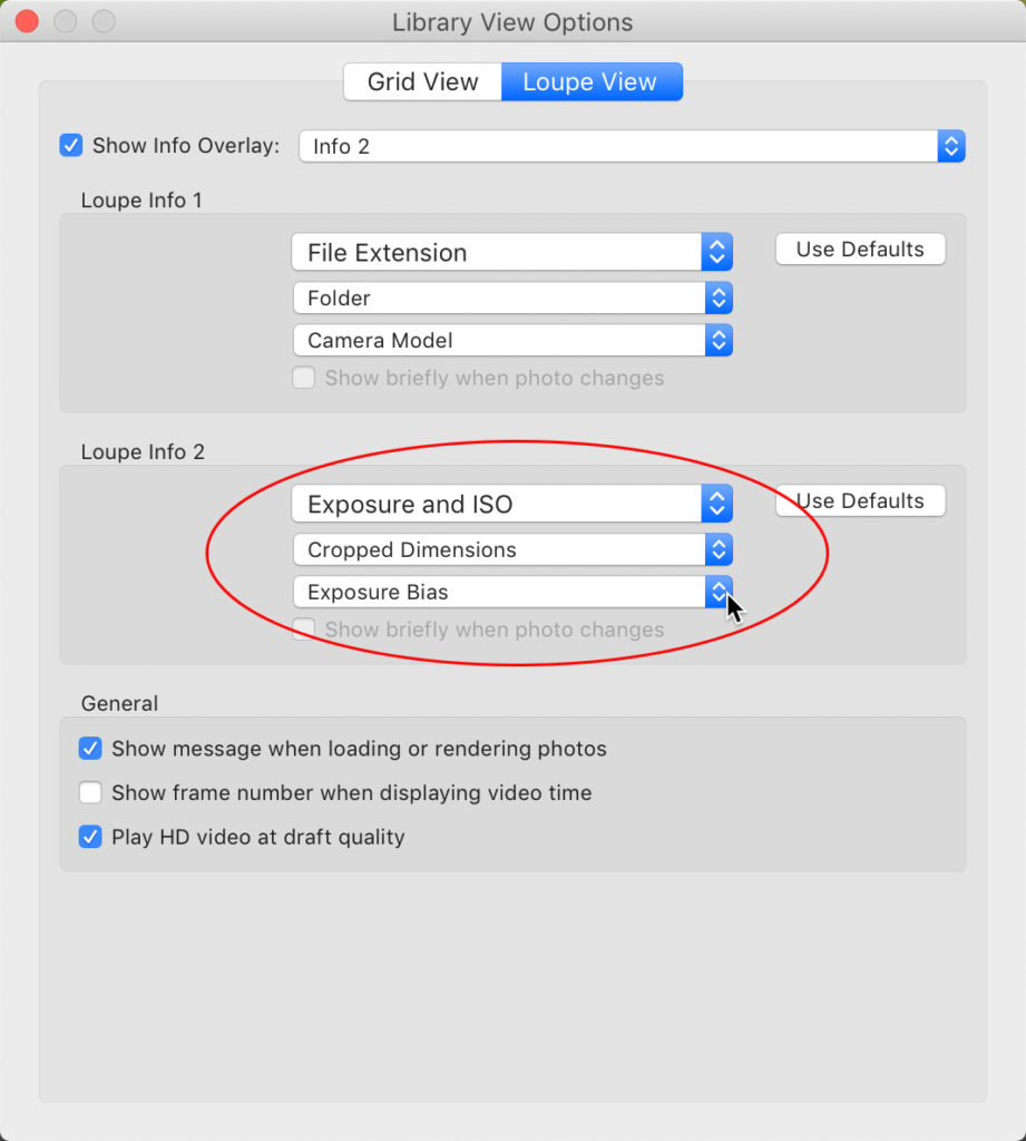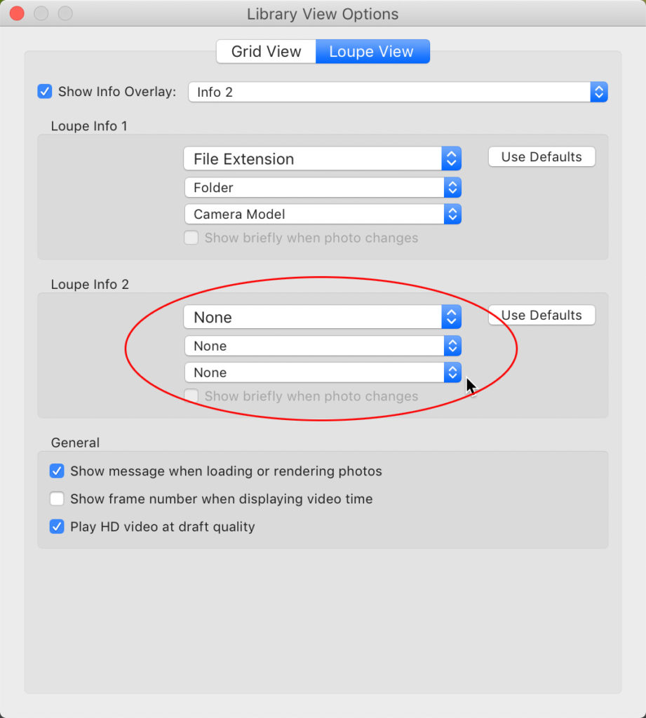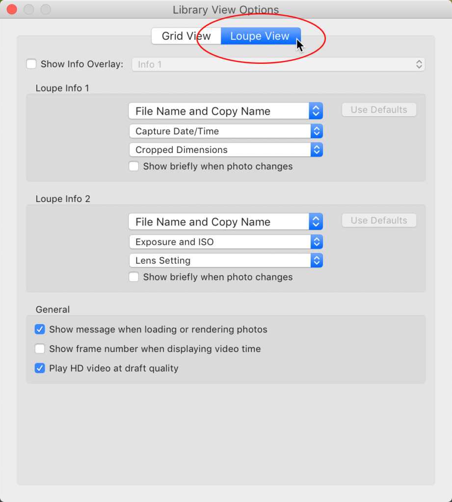 Yes, the Loupe View info overlay is what appears in that Tooltip. Not super obvious, but bear with me. The default settings include potentially useful information, but what is useful to me may not be to you. What if you didn’t want any information to display at all? Let’s explore some options.