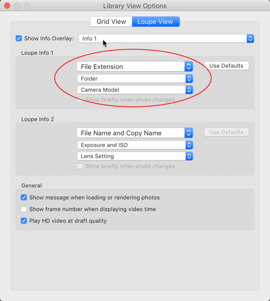 Starting with Loupe Info 1, for each drop down menu, choose a data point that you would find useful either here in Loupe view or in a tooltip when hovering your cursor over a photo. For example, when looking in large collections or smart collections I’ve often found it useful to know the file type, folder where the photo is stored, and what camera it came from in that tooltip, so those are the options I configured for Info 1.