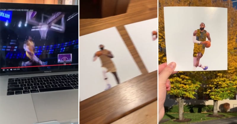 Artist Rudy Willingham created a clever stop motion video of NBA superstar LeBron James dunking. Frames of the dunk were printed, carefully cut, and then photographed while being held in front of a real-world location.