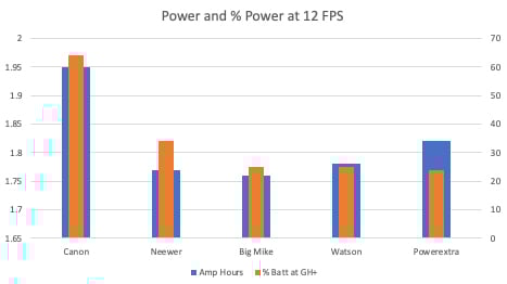 The blue columns represent the gross usable power in the battery, which Canon won by about 10-15%. The orange columns represent the percentage of the battery’s power that is applicable to the higher-wattage mode allowing for 12 frames per second before the waning wattage fails over to a lesser framerate mode.