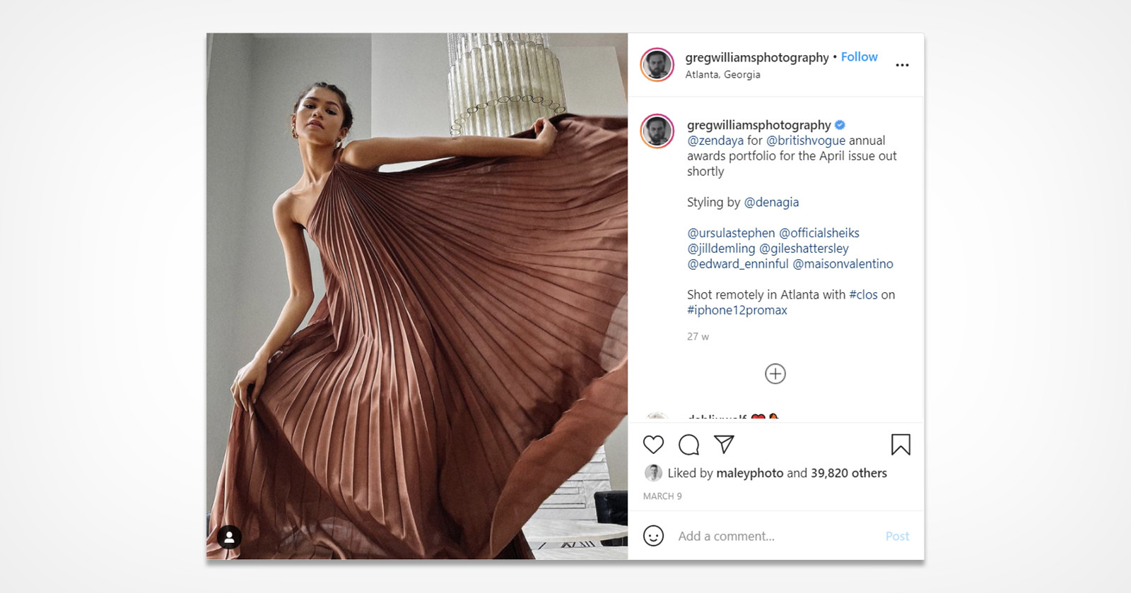 Celebrity fashion and portrait photographer Greg Williams recently photographed Zendaya for British Vogue through a virtual photoshoot. He used the virtual photo app CLOS, which allowed him to control her smartphone from the other side of the world.