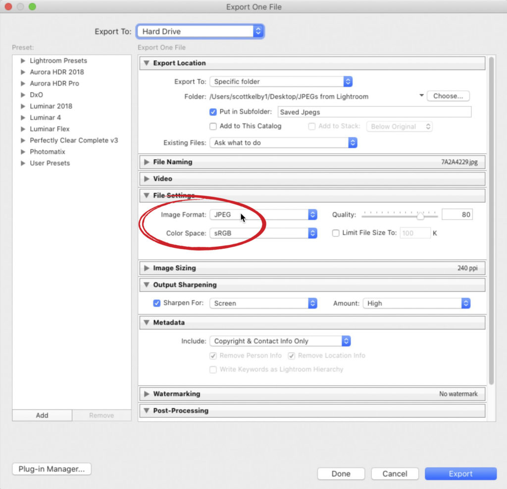 When you choose Export, it brings up the Export window (shown above). Scroll down to the File Settings sections and from the Image Format pop-up menu (shown circled above in red), choose JPEG (or whichever format you want to save your image in, you can choose TIFF, PSD, and PNG among others).