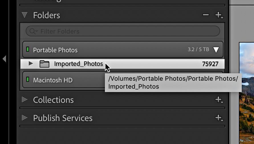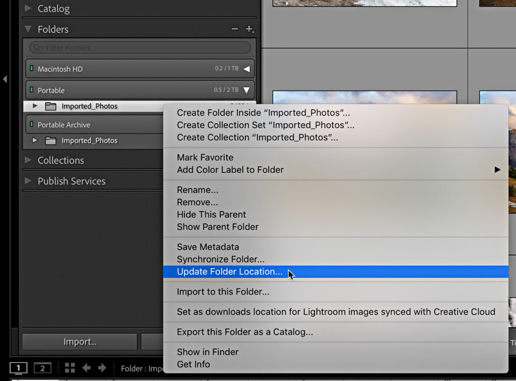 The key here is to right-click the top-level parent folder in the Folders panel under the first drive you want to update. In my case it was the drive named Portable, and under that Volume Browser was the parent folder called Imported_Photos, that’s the folder I wanted to choose for this action.