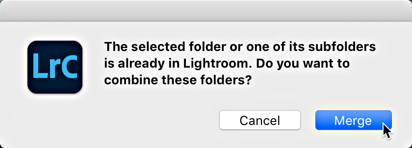 Now, because I merged the contents of two drives under one parent folder, and that parent folder was already in Lightroom, I was greeted with a dialog that informed me of this, and asked if I wanted to combine those folders.