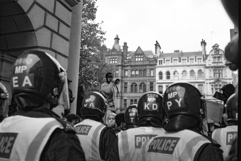 “MOVE OUT OF THE F**KING WAY!” is exactly what I remember the officer shouting at me as I made this photograph. The expression on his ruddy face, the jovial protestor with his thumbs up, all barrelling towards me as I burned the exposure onto the 13th frame of a roll of HP5+.