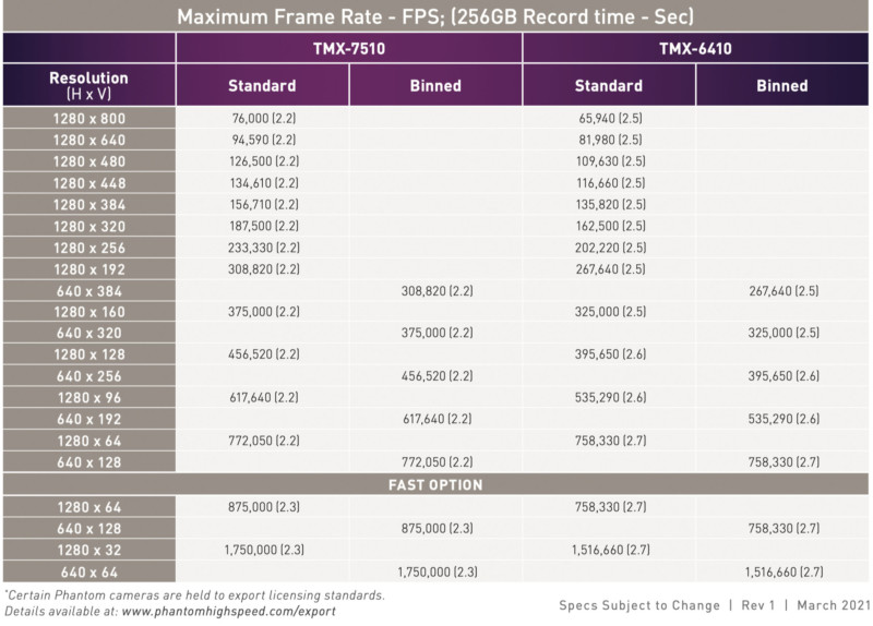 The TMX 6410 has the same BSI sensor found on the 7510 and has similar features but at a lower maximum framerate. While the TMX 7510 can capture 76,000 frames per second at its 1 MP resolution, the 6410 can do the same resolution at 66,000 frames per second. Additionally, the TMX 6410 has a maximum framerate of 1,500,000 per second compared to the 7510’s 1,750,000 per second.