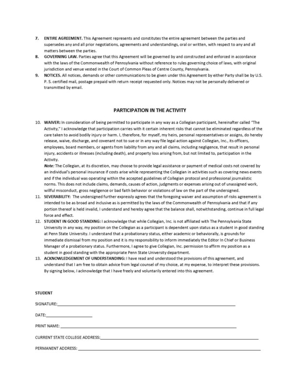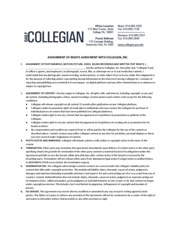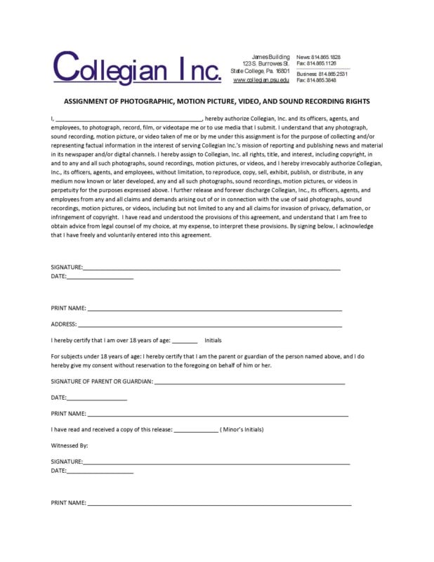 “I hereby authorize Collegian, Inc. and its officers, agents, and employees, to photograph, record, film, or videotape me or to use media that I submit,” the contract reads. “I hereby assign to Collegian, Inc. all rights, title, and interest, including copyright, in and to anhy and all such photographs, sound recordings, motion pictures, or videos, and I hereby irrevocably authorize COllegian Inc., its officers, agents, and employees, without limitation, to reproduce, copy, sell, exhibit, publish or distribute in any medium now known or later developed, any and all such [items] in perpetuity for the purposes expressed above.”