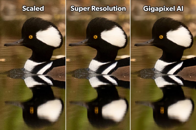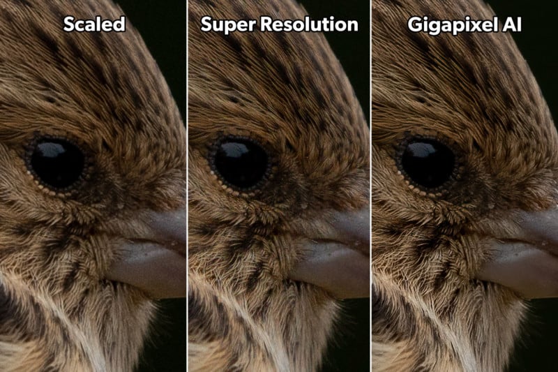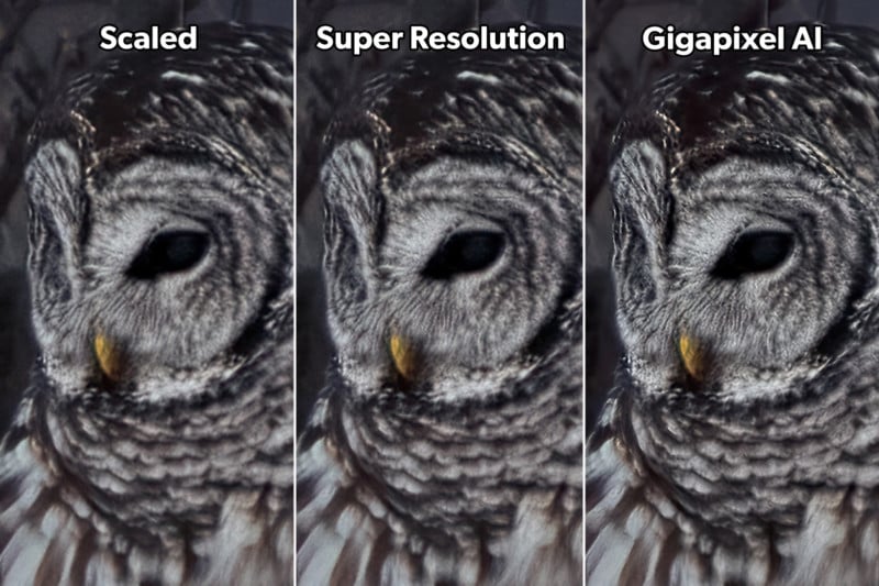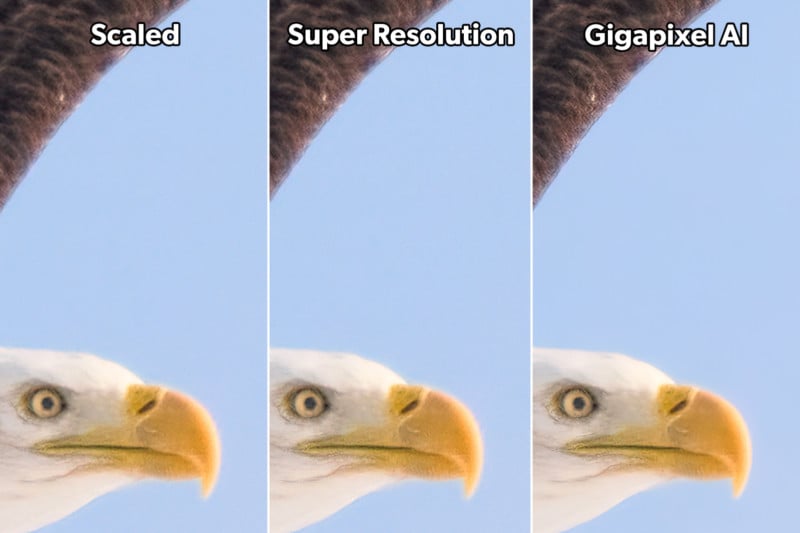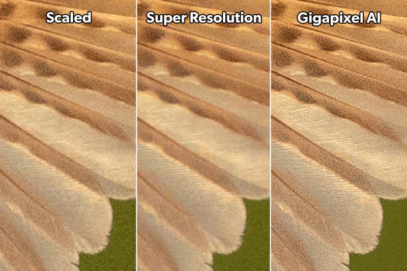 To my eye, the differences between basic scaling, Super Resolution and Gigapixel AI to make the image 106 megapixels are hard to see. Between scaling and Super Resolution, there’s a slight edge to sharpness with the latter. Then between Super Resolution and Gigapixel AI, it’s Gigapixel AI that seems to have a more noticeable effect. While I find Gigapixel to better clarify the beak and eye, it’s not without adding some unsightly artifacts in the 100 percent crop.