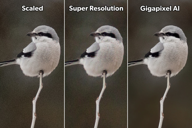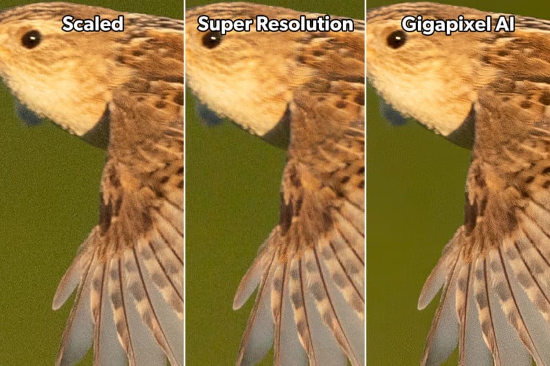 Another great use of capturing more of a scene to crop later are small, unpredictable birds in flight. With this comparison, I find that Gigapixel AI did the best job, but not without fault. There are some noise splotches that bug me, but once backed out of a 100 percent crop they are difficult to spot.