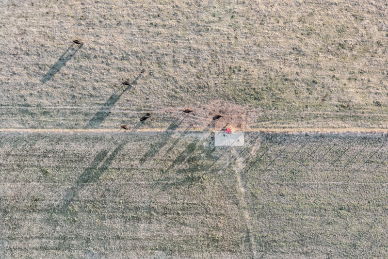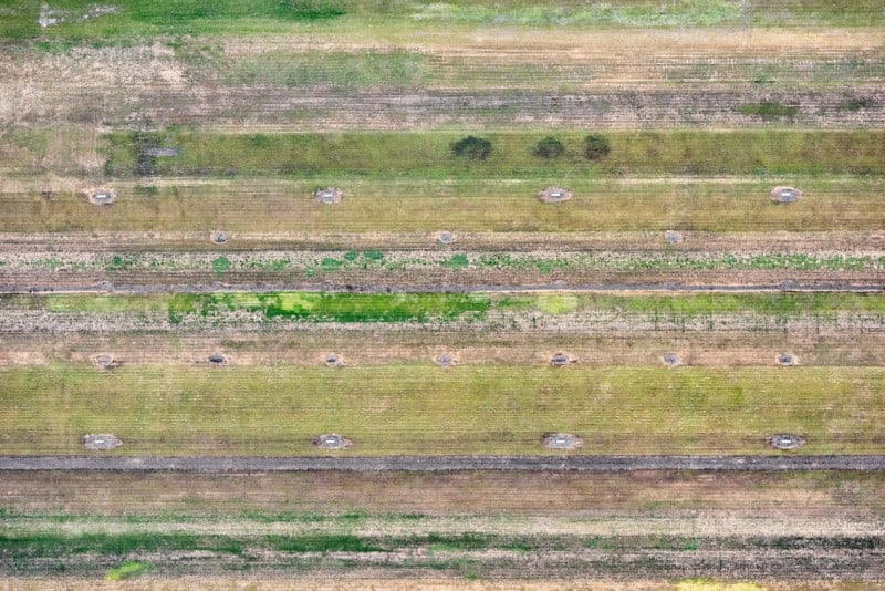 All of Wetherall’s photos in this series were taken from the basket of a hot air balloon a few hundred feet in the air with a straight-down perspective, excluding the horizon, sky, or any visual reference point.