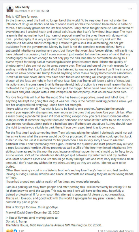 I did not know Max Ganly, but I was aware of his stellar reputation as a photographer. He ended his life today after posting a suicide note on FB. Reach out to your family and friends–hold them close. https://t.co/eHrMcQxAXn #SuicidePrevention #SuicideAwareness #BeKind