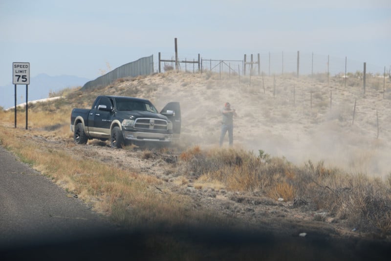 “I was nearing the border patrol by White Sands National Park, near Holloman Air Force Base, when I decided to turn onto the other side of the highway and take more stock photos for my collection and let my dogs get out,” Napoleon tells PetaPixel.
