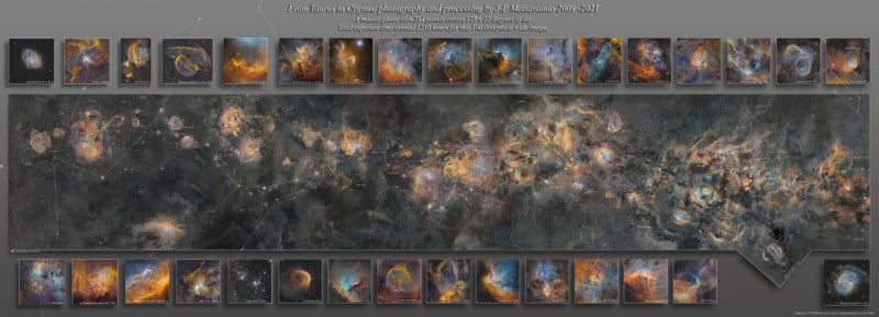 “My processing workflow is very constant so very little tweaking was needed between the mosaic frames,” Metsavainio writes. “Total exposure time is over 1250 hours. Some of the frames have more exposure time than others.”