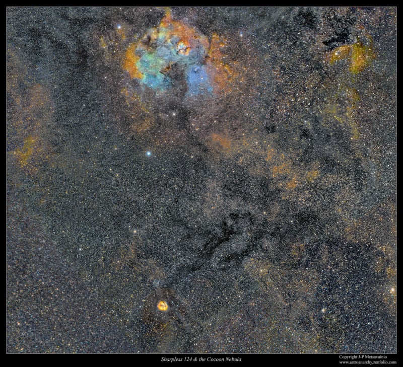 A closeup from the main image shows the Sharpless 124 at up and the Cocoon nebula with a dark gas stream at bottom.