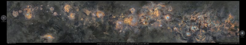 Metsavainio began shooting for the project back in 2009. For the next 12 years, he focused on different areas and objects in the Milky Way, shooting stitched mosaics of them as individual artworks. To complete the ultra-high-resolution view of the Milky Way as a whole, Metsavainio then set out to fill in the gaps that weren’t covered by his original artworks.