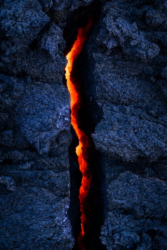 “Seismic activity didn’t show any increases in activity before new fissures developed, so there was literally no warning,” he continues. “This actually came close to happening on one of the nights I was there. A new fissure opened up where I had been sitting about 10 hours prior.