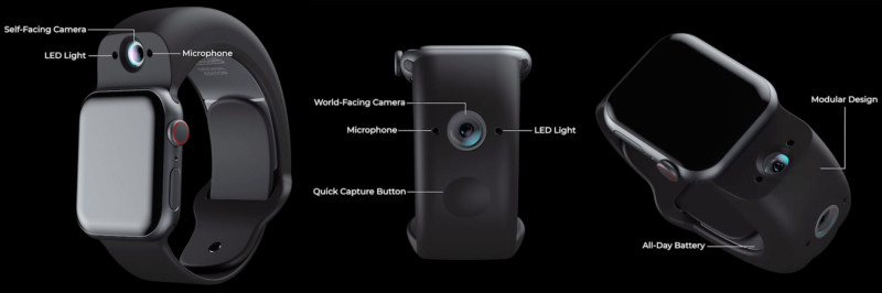 The strap noticeably bulkier than a typical Apple Watch strap, but that is to be expected since it integrates two HD cameras and its own power source. The company advertises the Wristcam as giving the wearer “freedom to instantly capture and share high-quality photo and video, straight from your wrist.”