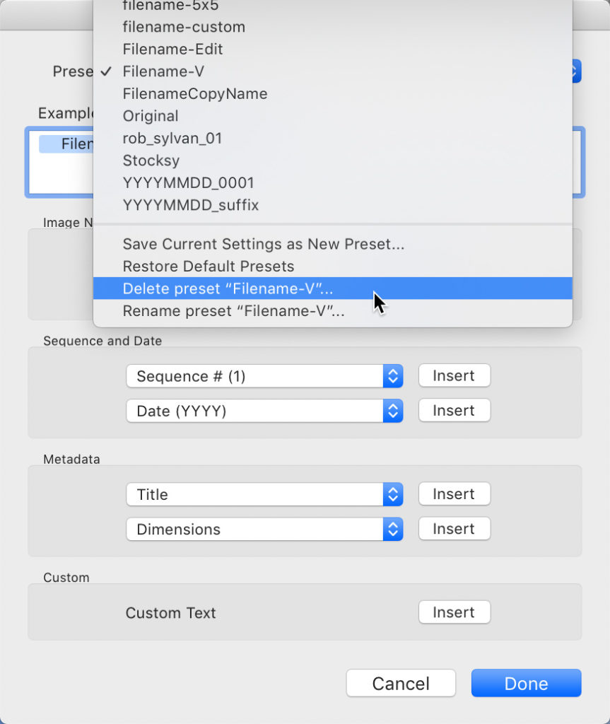 While you are there, note that is also where you find the options to rename or delete the currently selected preset. So, if you want to rename or delete a preset, first you select it within its native popup dialog, then click the drop-down menu a second time to choose your desired option.