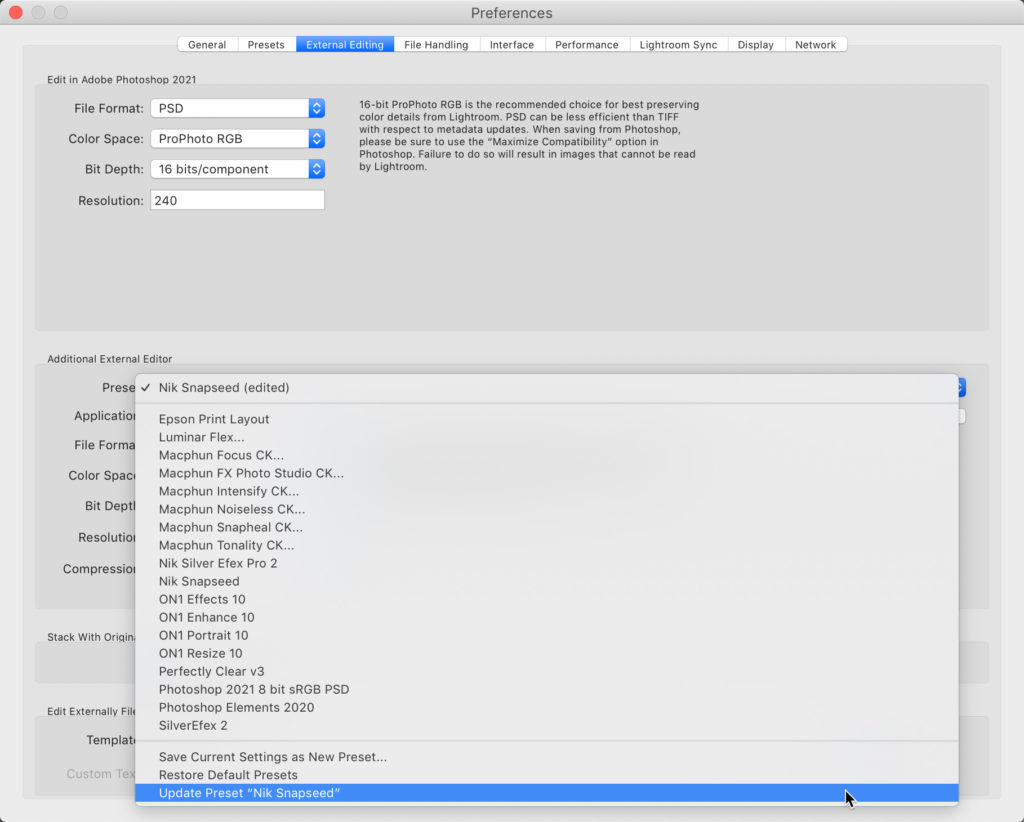 The answer, like to so many things, is simple once you know how. In this case it is just not at all obvious. For these settings you’d need to know to go into the External Editing tab of the Preferences (under the Lightroom Classic menu on Mac and under Edit on Windows). Once there, you could select your desired external editor preset from the Additional External Editor Preset drop-down menu to call up its settings.