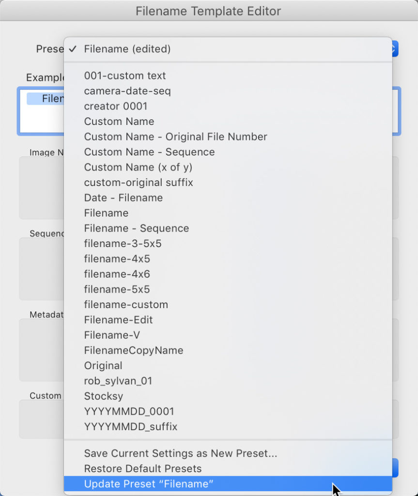With that preset’s settings displayed, you can configure as you desire (and note the name of the preset changes to edited once you make a change). But that’s not all, then you need to know that you must click that same Preset drop-down menu and choose Update preset from the very bottom of that menu in order for your change to stick for good.