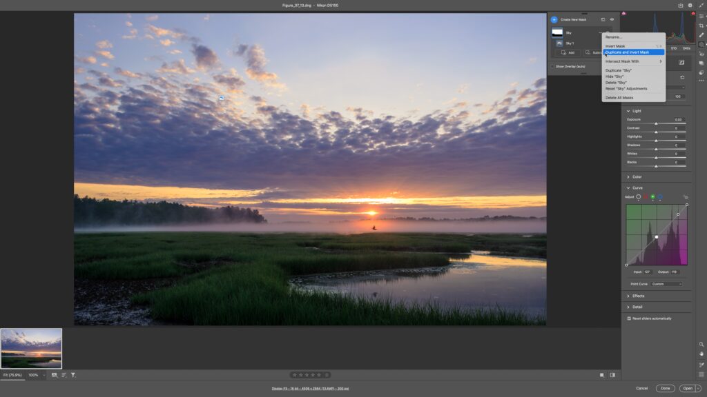 Using the existing Sky Mask, I’ll click the three-dot menu next to it in the Masks panel and choose Duplicate and Invert Mask so I can work on the foreground separately from the sky.