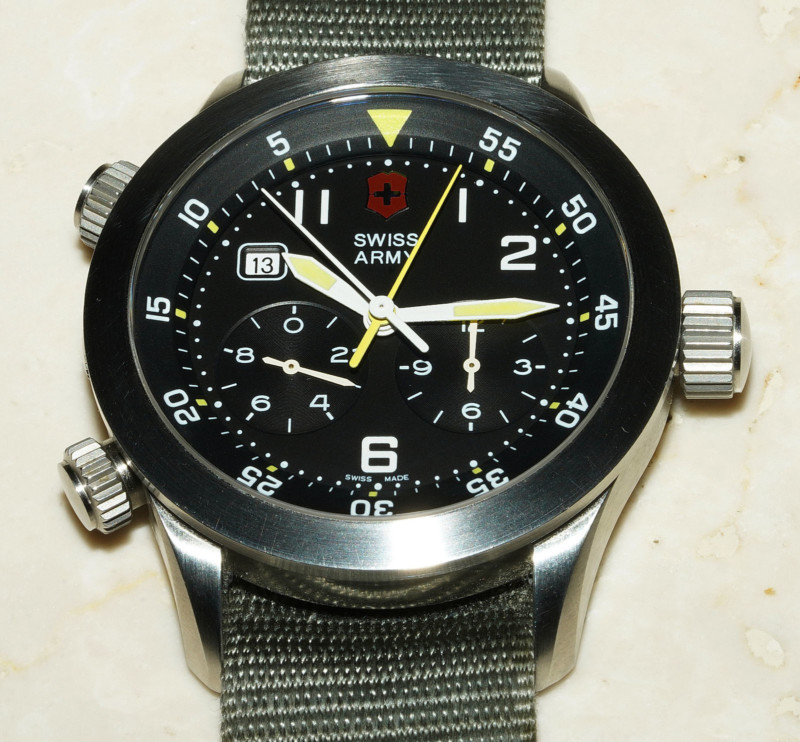 The easiest way I’ve found to photograph a watch is with a pop-up flash. I just shoot from slightly below center to avoid reflections. But a shoe-mounted flash is so high that I must shoot from well below center to avoid reflections – leading to an oblique view. (The crystal of this watch is flat. Domed crystals pose a greater lighting challenge).