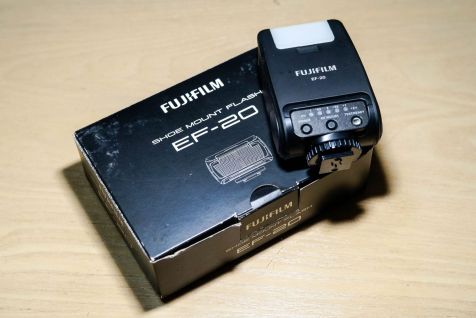 A set of Fujifilm EF-20 flash for sale, in very good condition. Slight scratches on one side of the flip-out diffuser. Comes with box and documentation. Batteries included.