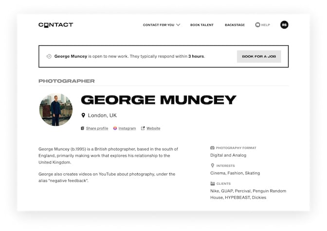 Instead, the platform does not take any money from creators but charges the booking companies a 20-percent fee on transactions. So far, Contact has onboarded almost 600 creatives and served over 1,400 clients, such as Depop, Farfetch, Nike, Vivienne Westwood, and Vogue.