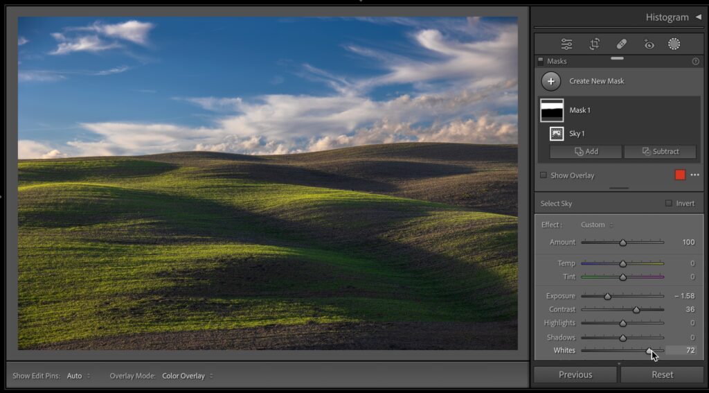 STEP FIVE: Now that the sky is selected, my go-to sky fix is to (a) lower the Exposure until the sky looks good, (b) Increase the Contrast so the dark parts of the sky get darker and bright parts get brighter, which makes the color looks more saturated, and (c) I increase the Whites amount quite a bit, so the clouds don’t look gray from the exposure being lowered so much.