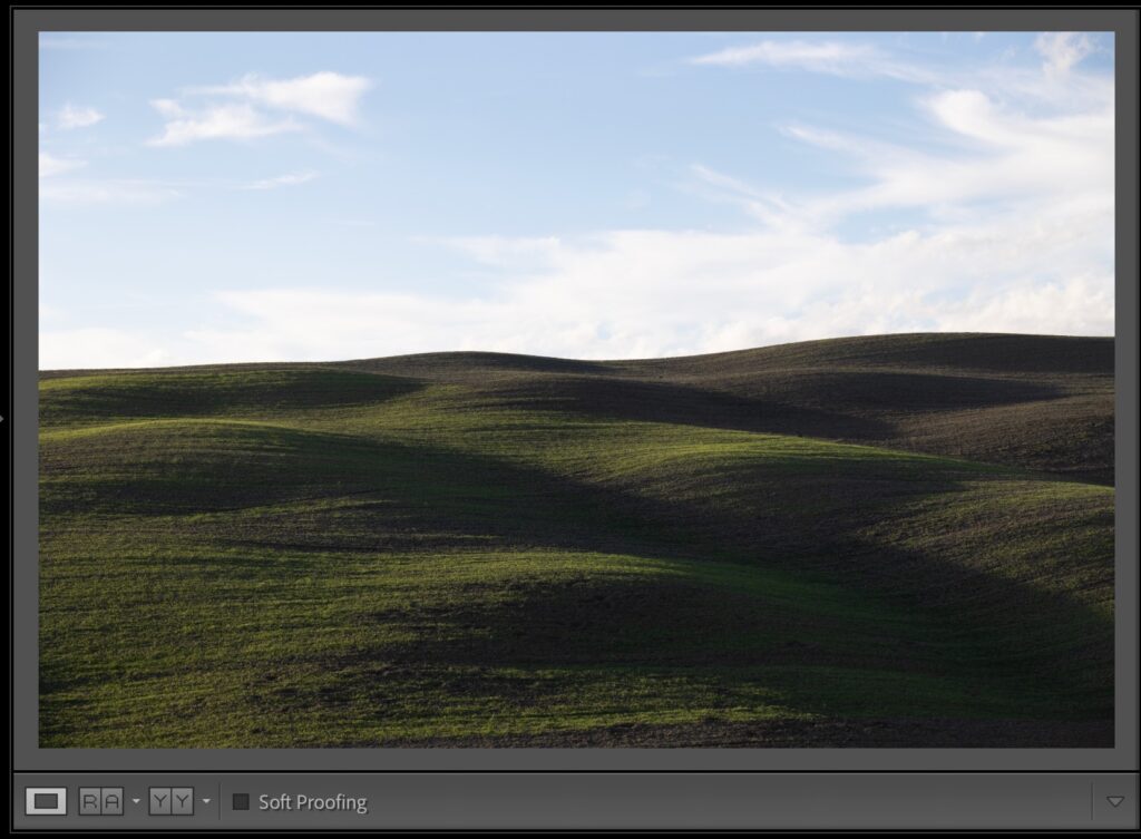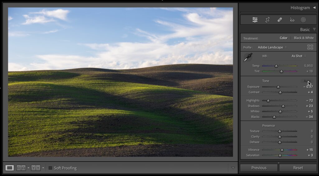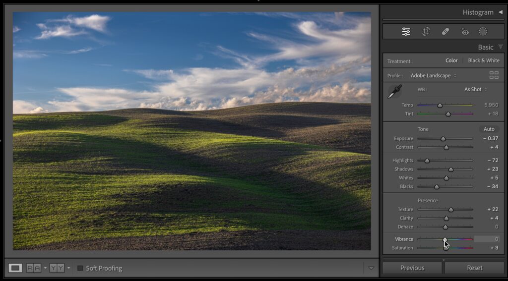 STEP SIX: I finish things off by raising the Texture to bring out some detail in the foreground and a bump up the Clarity just a hair (more detail), and lastly, I lower the Vibrance amount added by the ‘Auto’ button earlier so the colors don’t look too bright (it’s mostly a problem with greens – they start to look neon-ish, so you could go to the HSR / Color panel and lower the Saturation of the yellows and greens, but this is just quicker and easier – as long as the sky still looks good after you lower the overall Vibrance.