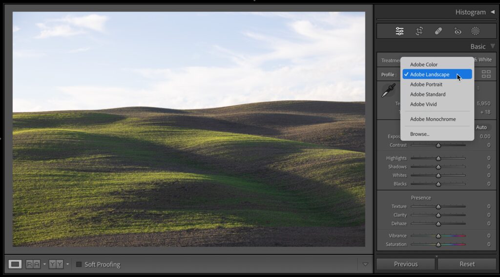STEP TWO: To get a better starting place, I generally choose the ‘Adobe Landscape’ Raw profile from the Profile pop-up menu at the top of the Basic panel (as shown here).