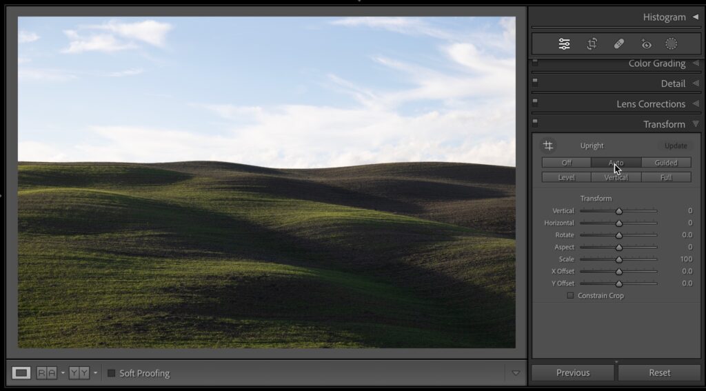 STEP ONE: The image is a little crooked, so head to the Transform panel (called the Geometry panel in the cloud version of Lightroom), and under ‘Unright,’ click on Auto (as seen here). By the way – you generally get better results from Upright if you first apply a Lens Profile in the Lens Correction panel (called the ‘Optics’ panel in LR cloud), but since the photo was taken with a mirrorless camera, it assigns the proper lens profile automatically for you).