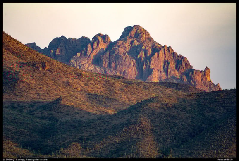 Here’s a technical detail that illustrates the depth of field issues with telephoto lenses. When I photographed the Ragged Peak image, I thought that the cactus in the foreground were far enough that they would be subjects at infinity, like the mountains. I therefore used an aperture of f/8. On the Sony a7R IV, diffraction begins to limit sharpness after f/6.7. On the LCD, the image looked sharp enough, but when reviewing the image at 100% on a computer screen, it turned out that the mountain was a bit soft because of insufficient depth of field.