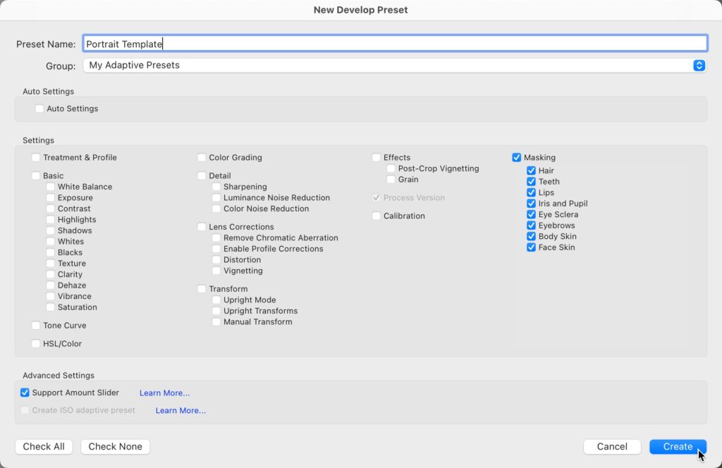 Let’s save all that work as a preset. Click the + sign at the top of the Presets panel and choose Create Preset. In the New Develop Preset dialog box, click the Group drop-down menu, choose New Group, and name the new group something like My Adaptive Presets or whatever makes sense to you. Then click the Check None button at the bottom to clear all checkboxes. Under Masking, check the box next to each Mask Group name (this is why I had you rename those Mask Groups previously). I’d leave Support Amount Slider checked, but that’s all. Give your preset a meaningful name, like Portrait Template, and click Create.
