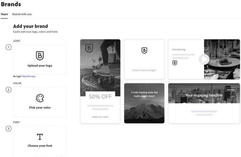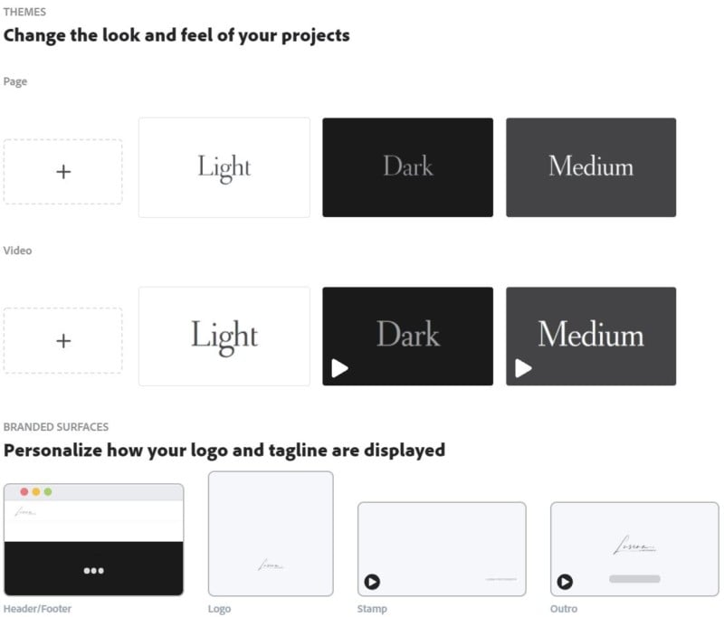 At the first glance, Adobe’s branding tools appear limited, however, once you add three main attributes — logo, primary color, and font type — more options appear such as the choice of font for headings and body text and the appearance of light, medium, and dark themes. CC Express doesn’t have a section for subheading font choice, though.