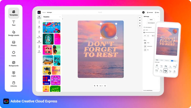 The new CC Express, same as Adobe Spark, is aimed at users who want to create fast visuals, such as brand graphics, collages, presentations, adverts, photo edits, and much more. The platform offers a large library of different templates to inspire ideas and kickstart projects, but also allows starting fresh with a blank slate.