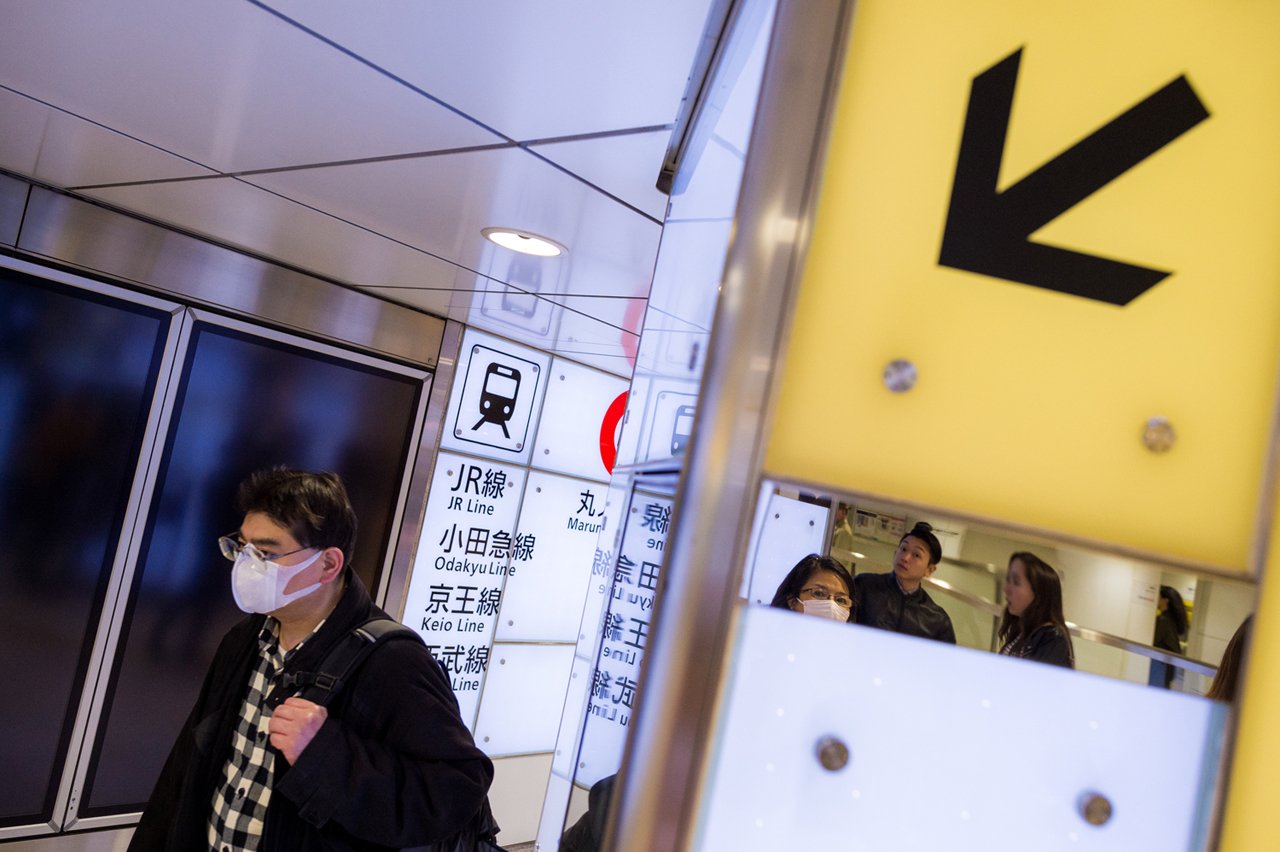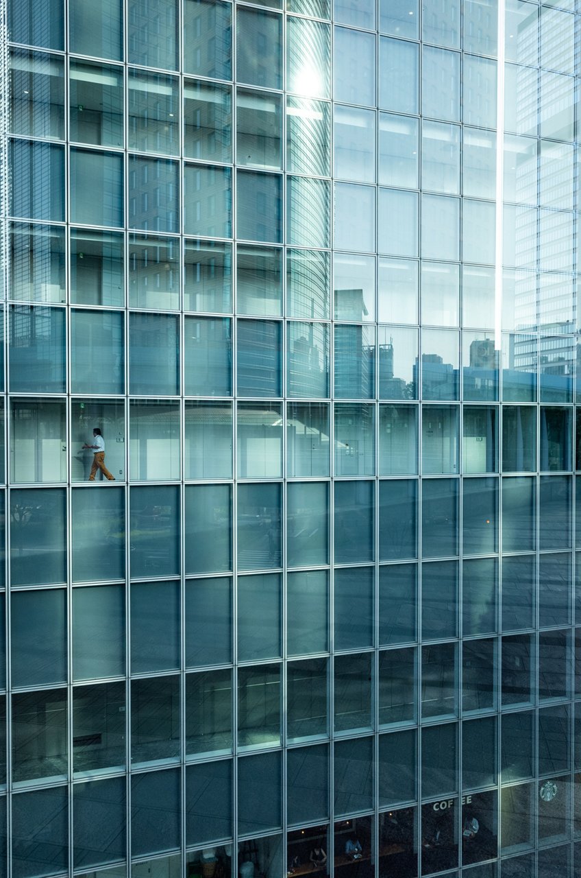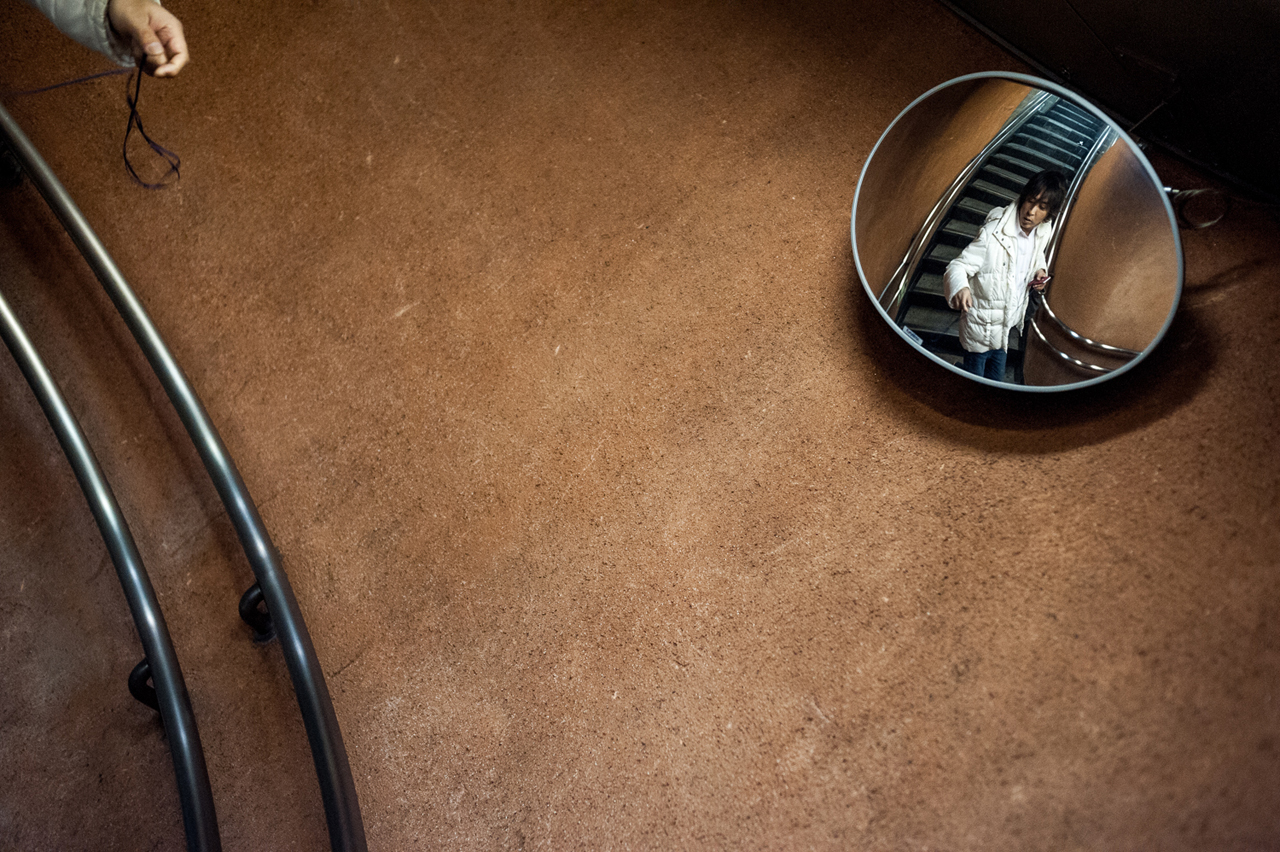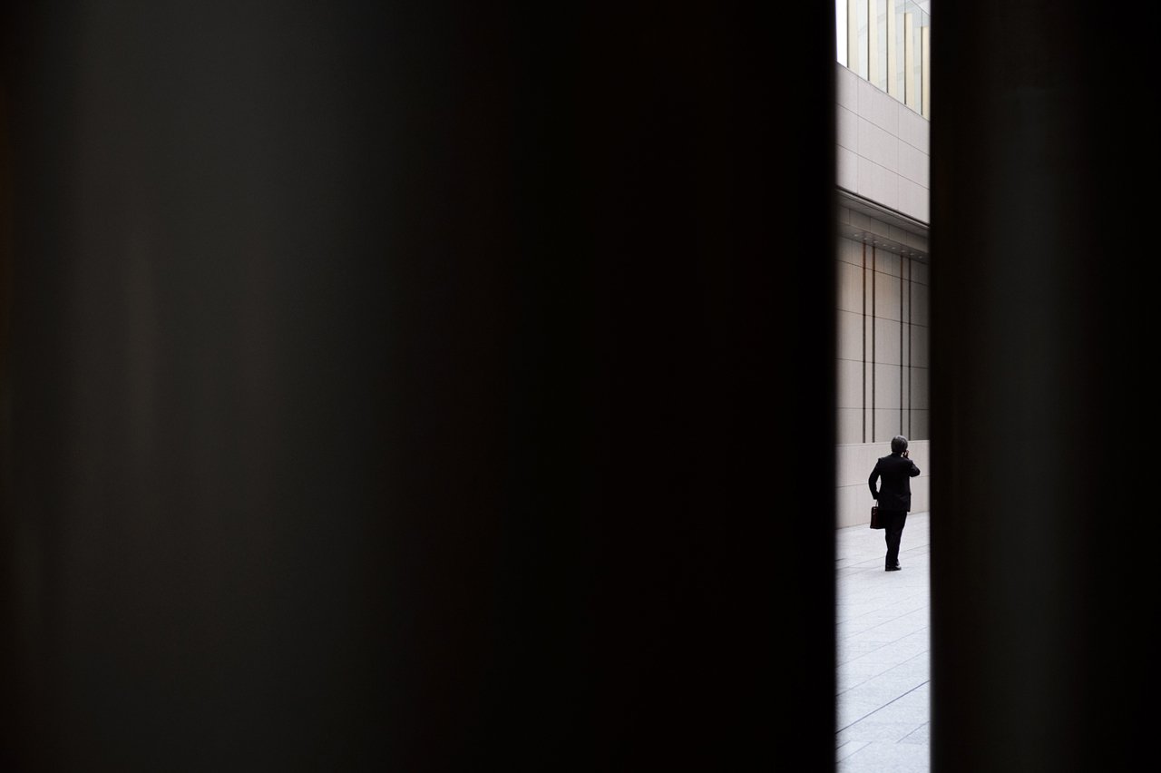 An extreme case of ‘tension’ and ‘isolation’ induced by the narrow space and the subject’s position close to the edge of the frame. This is intended to give a feeling of being ‘trapped,’ as a Tokyo office worker might feel.