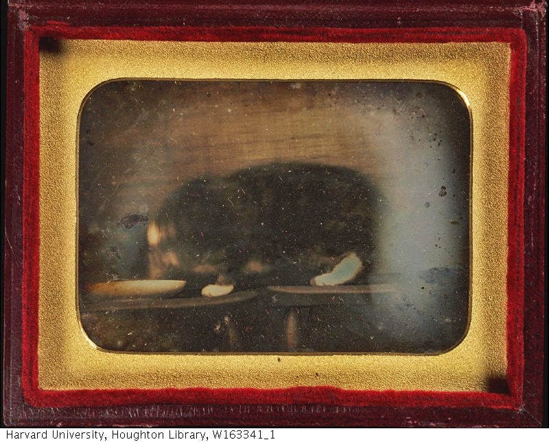 While we do not have a definitive answer for this question, the likeliest contender appears to be the above daguerreotype of a cat drinking from a bowl taken circa 1845 and at the Harvard Library of Harvard University.