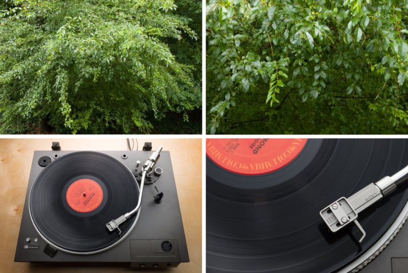 Ames used a kit lens that came with the Canon 20D in 2004 on his Canon R5 as the battery on the old 20D was toast. This kit lens is 17 years old! The two sets of photos of foliage and a turntable show remarkable quality. Each pair of photos below are wide-angle 18mm on the left and telephoto 55mm on the right. © Kevin Ames, photo courtesy Photofocus