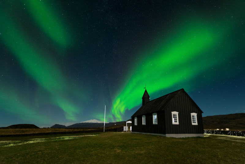 Northern Lights (aurora borealis) over The Black Church, Búdir, Iceland. Depositphotos
