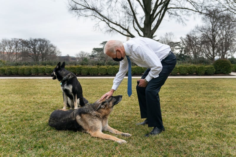 President Joe Biden greets the Biden’s dogs Champ and Major Monday, Jan. 25, 2021, in the Rose Garden of the White House. (Official White House Photo by Adam Schultz)