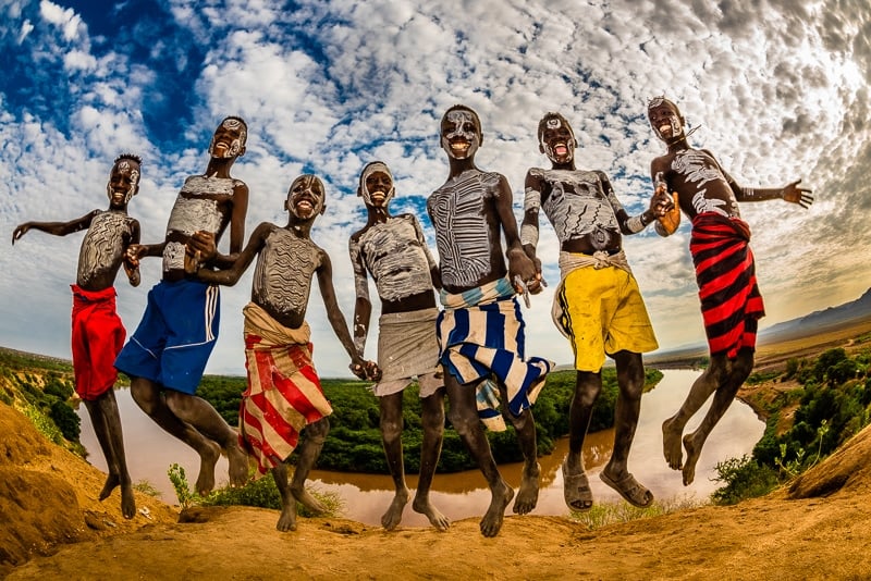Kara tribe boys with body chalk paintings on their bodies jump in the air, with the Omo River behind. Dus village, Omo Valley, Ethiopia. Omo Valley, Ethiopia.