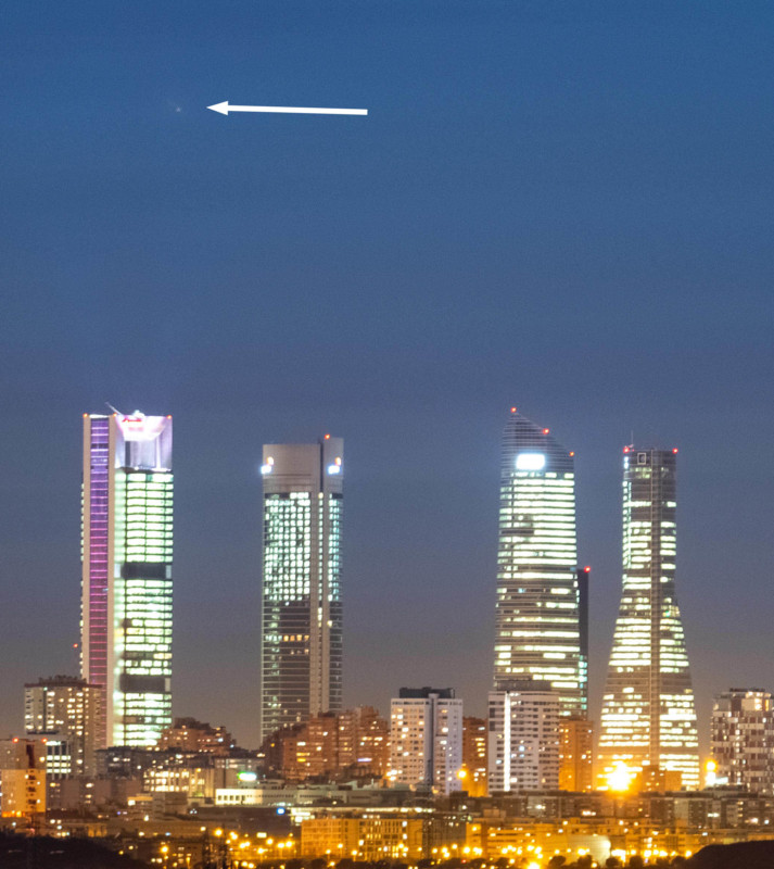 Comet Leonard above the Four Towers of Madrid. The comet can be seen as the point of light above the leftmost tower.