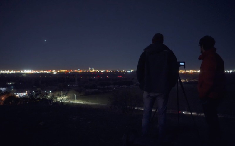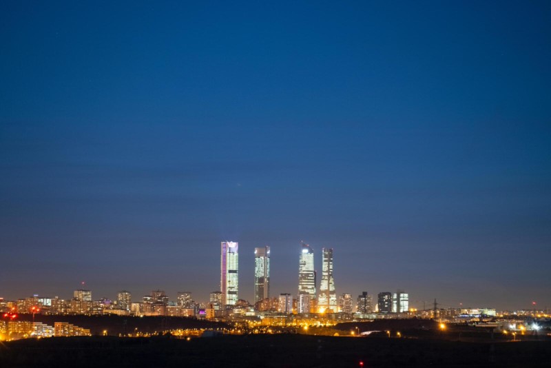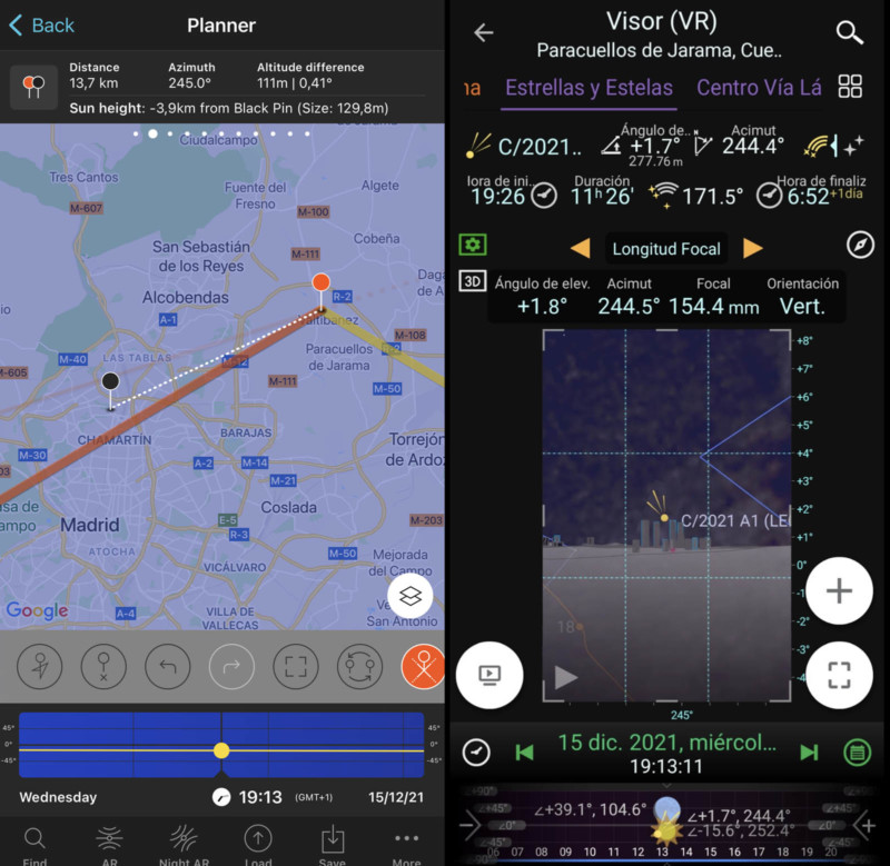 Javier did the planning with the PhotoPills and Planit Pro apps. He found the precise spot outside the city, getting as far as possible from the Four Towers (Área de Negocios de Cuatro Torres, Spanish for “Four Towers Business Area”), that would allow us to use a long lens to get that nice compression and to enhance the comet size against the skyscrapers.
