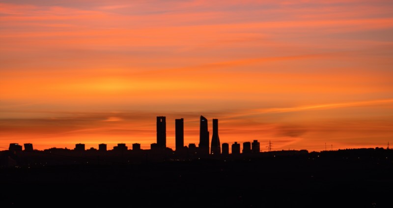 A wonderful sunset with silhouettes of the Four Towers of Madrid.