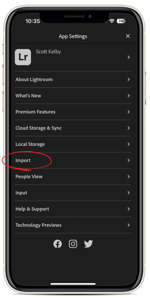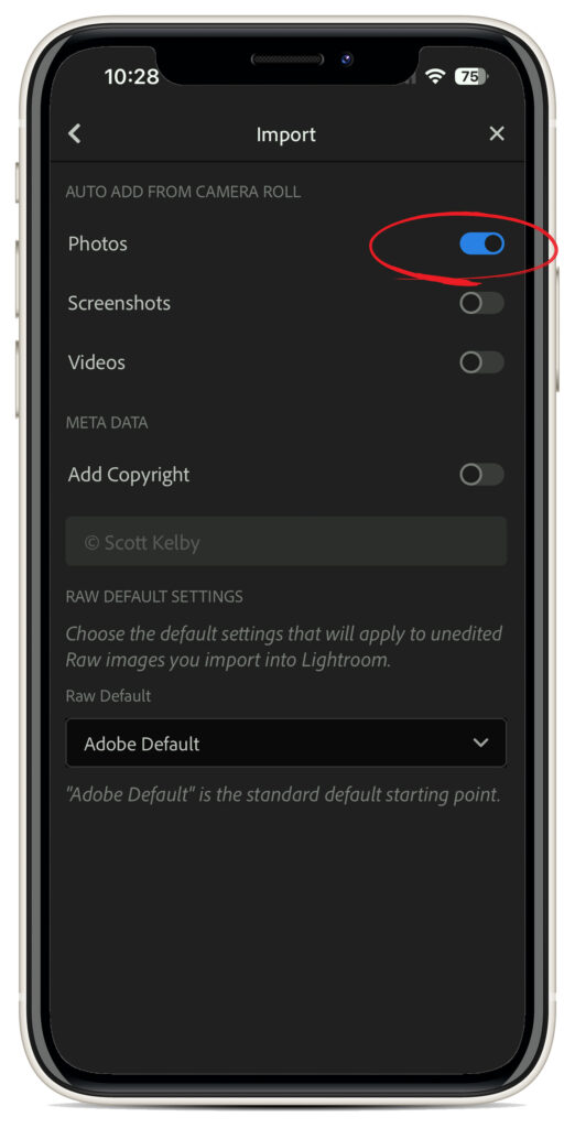 When the Import preferences screen appears (seen above), where it says “Auto Add from Camera Roll” at the top, toggle the switch to the right of “Photos” to the on position (shown circled in red above), and you’re done. It’s that easy – now, images you shoot with your phone’s camera will automatically be imported into Lightroom for editing.