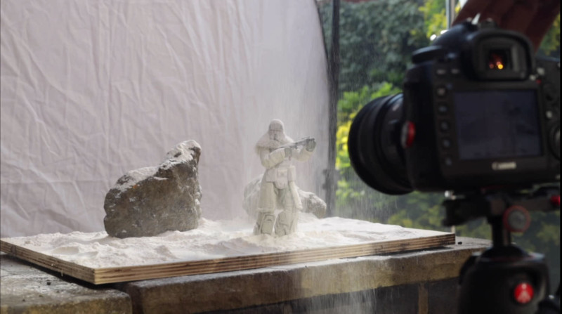 For the next scene, we wanted to go for a snowy blizzard environment, So we used a white reflector as a backdrop, and then spread some plain flour out on a wooden board. We then placed our characters in the scene and sifted flour down from above for the snow.