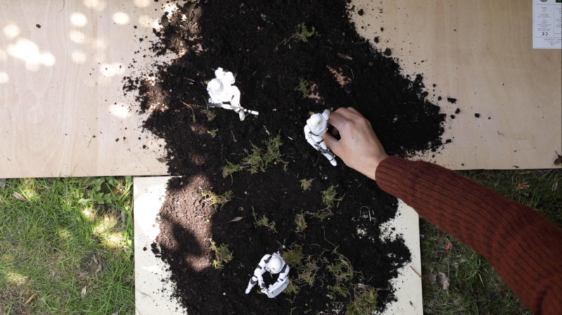 For the first scene, we used some old paving slabs as a backdrop, laid down some soil and then placed some rocks and moss in there to break it up a bit. We poured water on it to make it look boggy and help with the explosions.